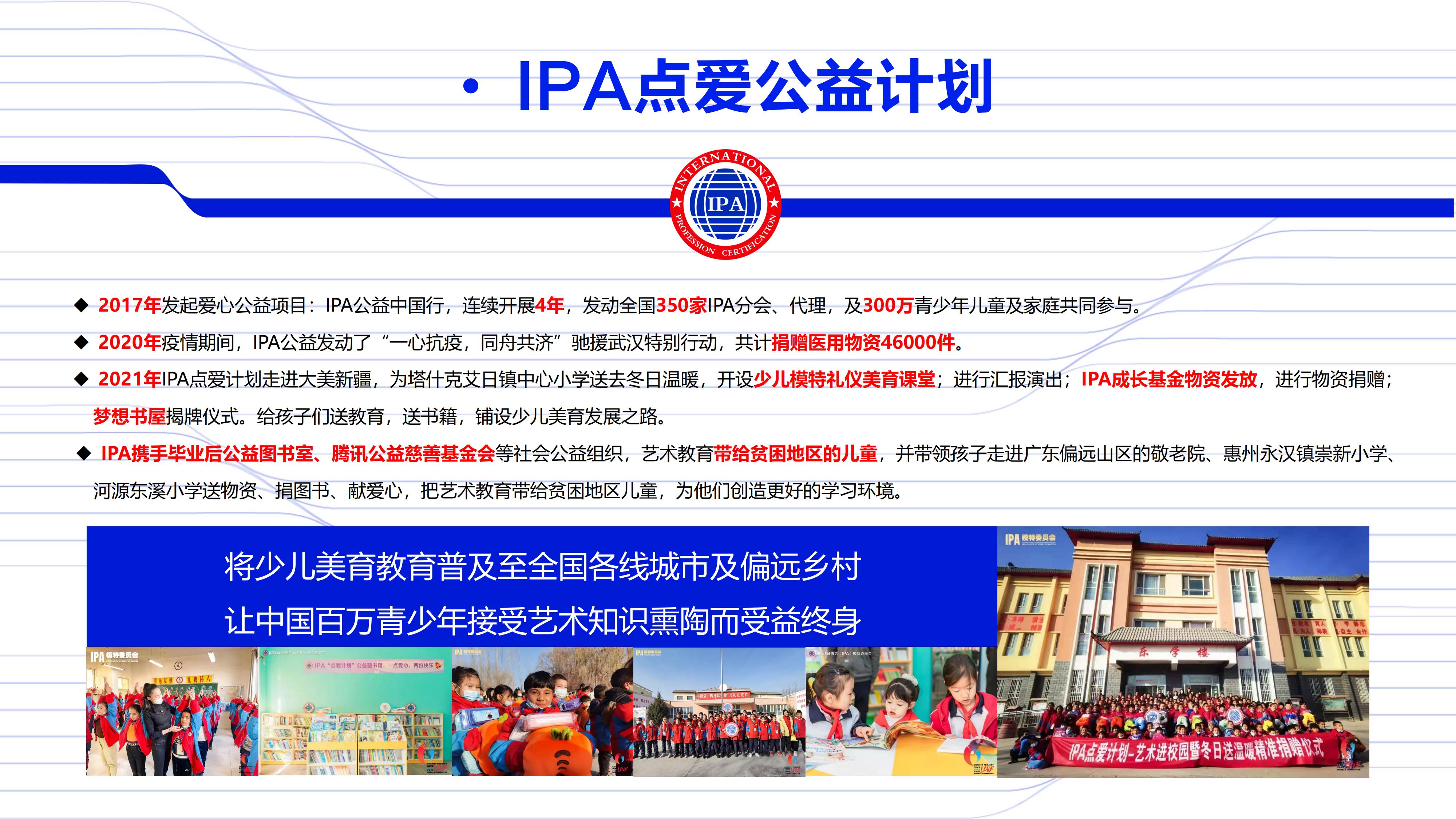 u 2021年IPA点爱计划走进大美新疆,为塔什克艾日镇中心小学送去冬日温暖,开设少儿模特礼仪美育课堂;进行汇报演出;IPA成长基金物资发放,进行物资捐赠; 梦想书屋揭牌仪式。给孩子们送教育,送书籍,铺设少儿美育发展之路。