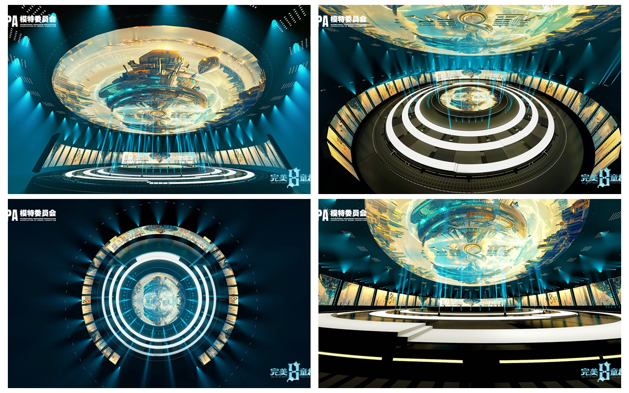 以圆形结构打造360°超长全景赛道,台面设计采用多环机械光灯带和可追踪光系统,底部同心圆聚能环轮廓灯、顶部漫射灯和聚光灯,可变换颜色和组合形式 营造不同的舞台氛围,折射、重叠、映照出无限可能。